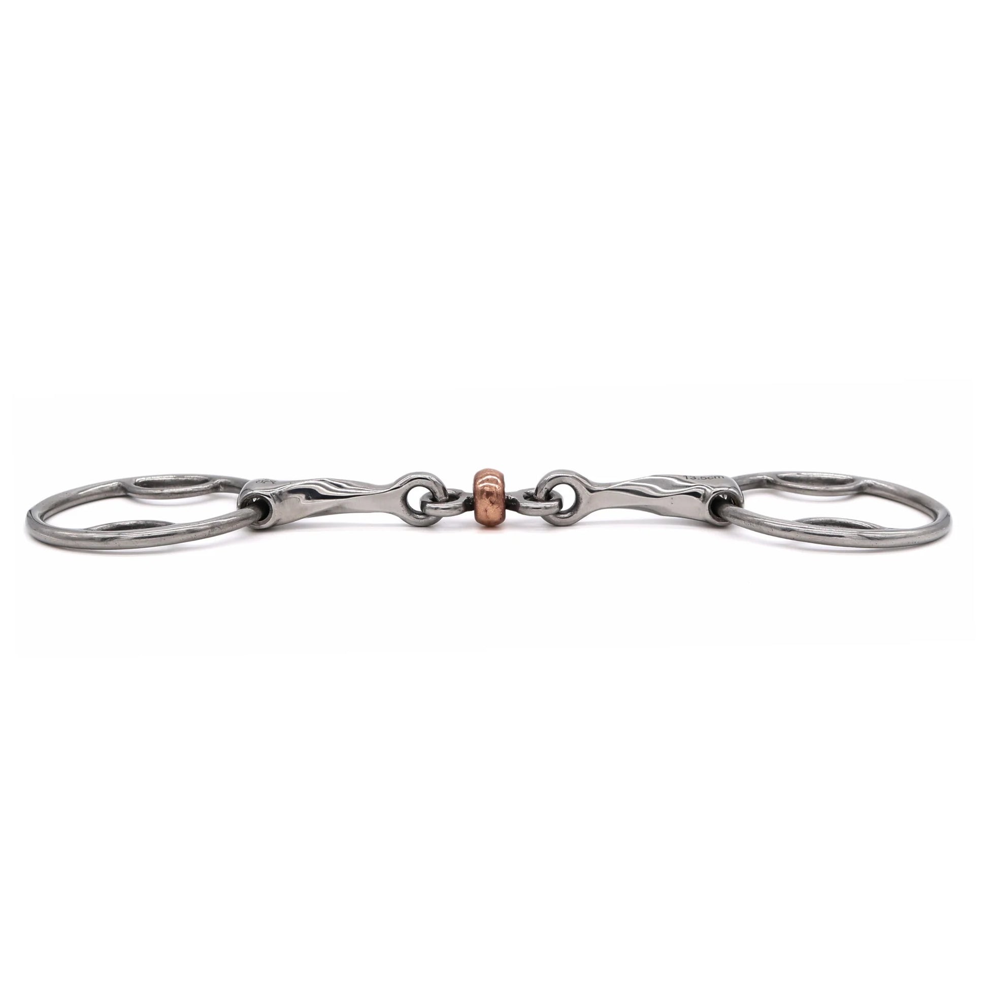 El freno Beval con rodillo de cobre y embocadura torcida (Slow Twist) cuenta con una embocadura de acero inoxidable con torsión lenta que mejora la distribución de la presión sobre las barras y la lengua, brindando al jinete un control más definido gracias al aumento de puntos de contacto. El rodillo de cobre estimula la salivación y la interacción con la lengua, favoreciendo una boca más suave y atenta, además de desalentar que el caballo se apoye en el freno.